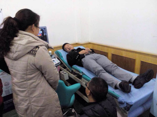 圖三:產(chǎn)品展示廳,客戶體驗電動超聲診療床中。